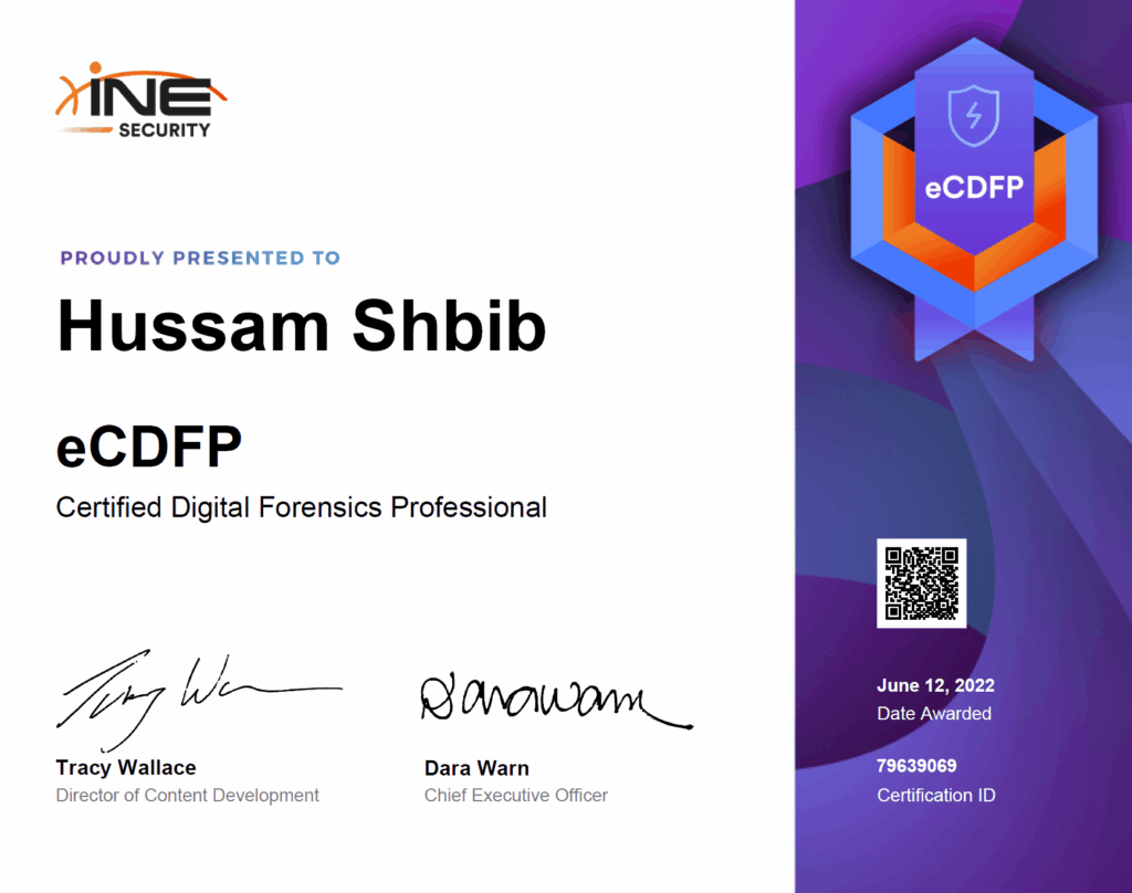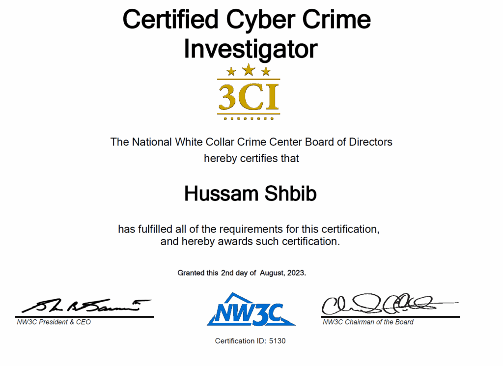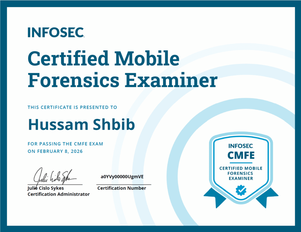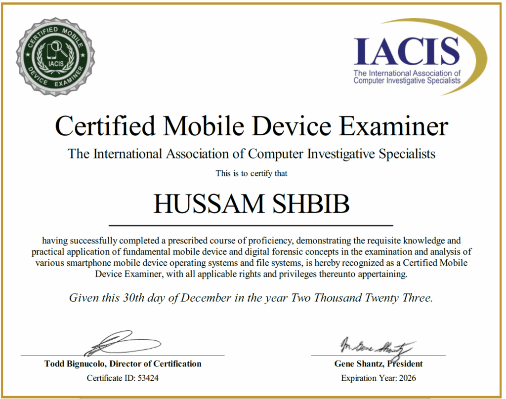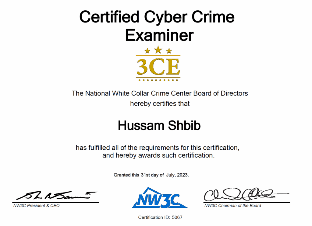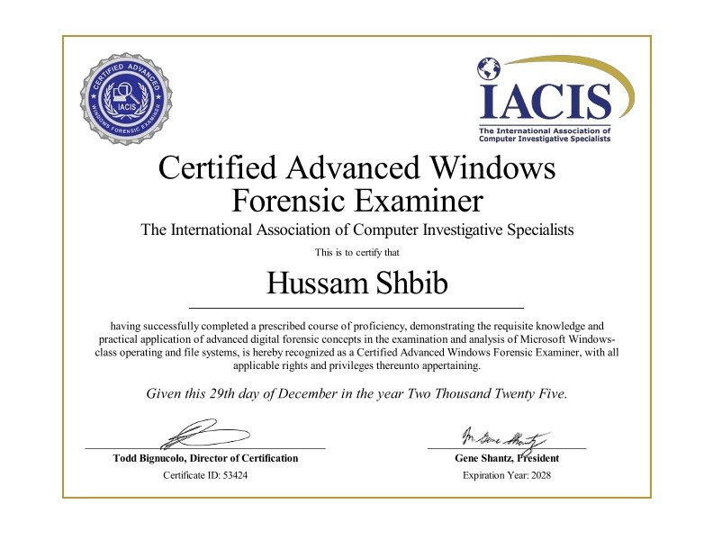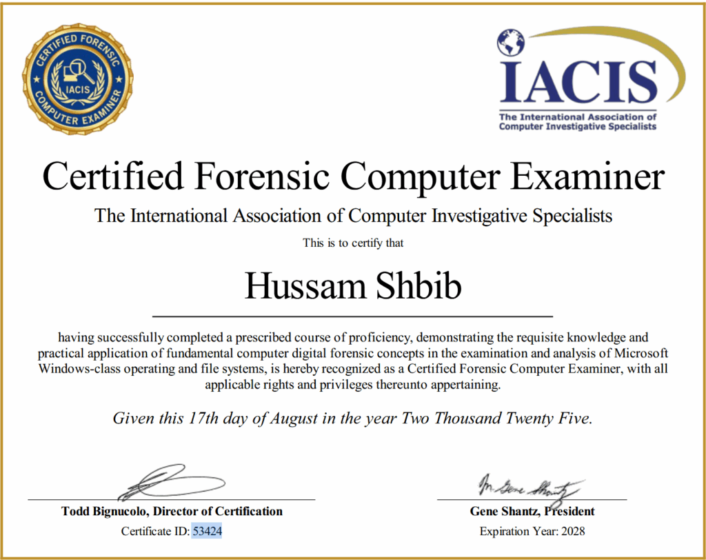 Husam Shbib holds several industry-recognized, hands-on cybersecurity and digital forensic certifications, including: